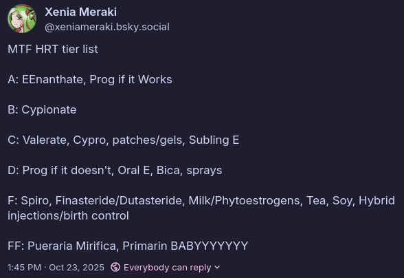 Transfems will usually need an antiandrogen, a medicine that suppresses testosterone specifically and only, if they use a less effective estradiol such as oral estradiol pills. Cyproterone Acetate is a very good antiandrogen, but banned in USA market because too high of dosages gave men with prostate cancer brain tumors (200mg+ vs the 12.5mg MTF HRT uses) and they didn’t give a fuck about anyone but cis men. Bicalutamide is technically legal but not often prescribed because of a healthcare scare (irrelevant, not worth your attention) and there are some liver concerns.