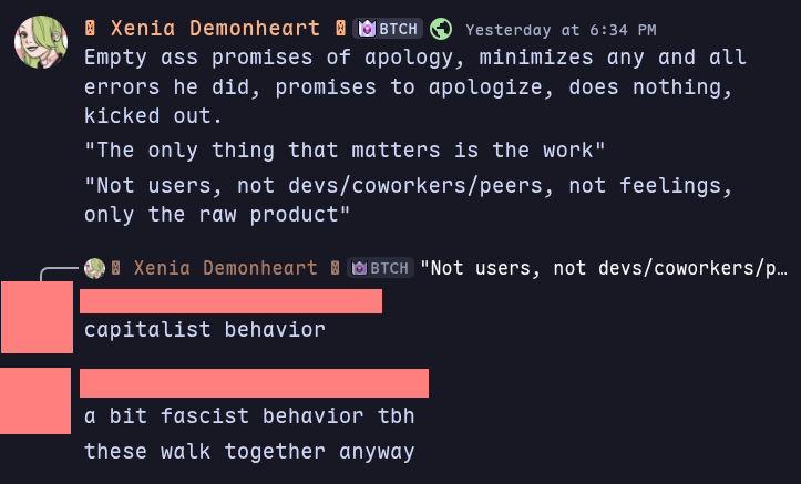 I HATE callout posts. I hate callout post culture. More often than not it’s very simple stuff that is no one’s business but between the callout-er and callout-ee. More often than not they are leveraged as weapons against racial and gender minorities. More often than not they are leveraged as a weapon against someone’s simple and benign sexual kinks. To a degree I wish I’d gone about things differently, gone to the head Bazzite maintainer(s) in private with my concerns… I’m sorry for not doing so. I was just frustrated at seeing this long line of offenses. Frustrated at seeing daily arguments and pissing fests in the dev discord channel.