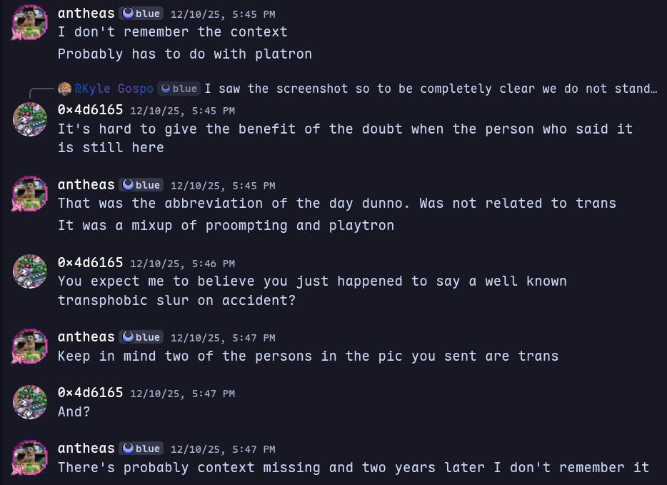 One thing: In my initial callout post, I pointed out how Antheas had used in casual conversation what I thought was an allusion to a trans slur “troon”. In later discord messages he has said that he didn’t know that slur existed, and it was a play on “Playtron” and “goon”. Your guess is as good as mine if that’s legitimately true. It ultimately doesn’t matter if a small part of the thing I was wrong about, but I do feel bad about it if it’s true because for a lot of people what jumps out at them is the trans slur usage and is most egregious. I LEGITIMATELY don’t know, I think I was wrong on the cuff on that one. I am hyper vigilante on trans slurs, I’m trans. Antheas is not trans and can be forgiven not knowing that one. The overall point is still the same.
