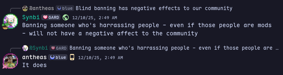 Synbi: “Banning someone who’s harassing people - even if those people are mods - will not have a negative affect to the community”